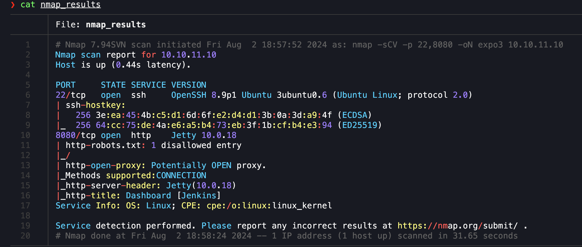 20 │ # Nmap done at Fri Aug 2 18:58:24 2024 -- 1 IP address (1 host up) scanned in 31.65 seconds