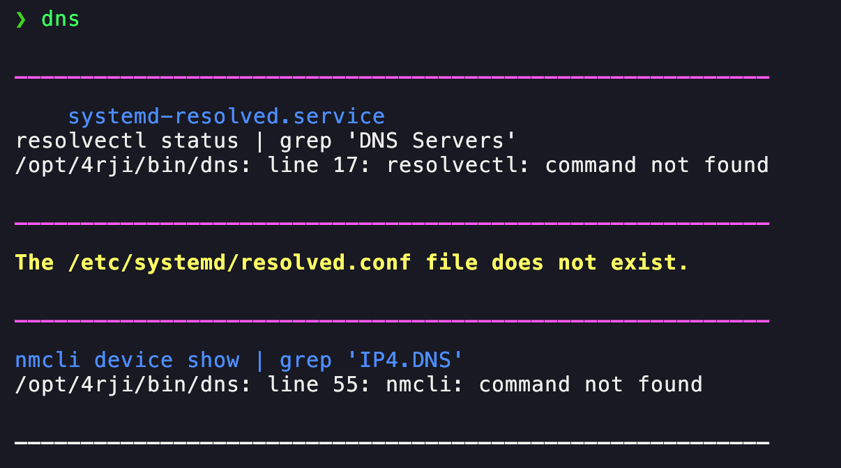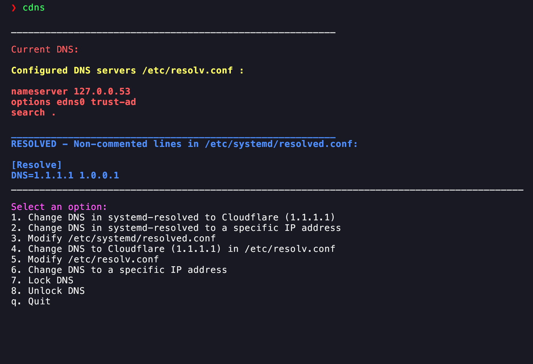Select an option: 1. Change DNS in systemd-resolved to Cloudflare (1.1.1.1) 2. Change DNS in systemd-resolved to a specific IP address 3. Modify /etc/systemd/resolved.conf 4. Change DNS to Cloudflare (1.1.1.1) in /etc/resolv.conf 5. Modify /etc/resolv.conf 6. Change DNS to a specific IP address 7. Lock DNS 8. Unlock DNS q. Quit