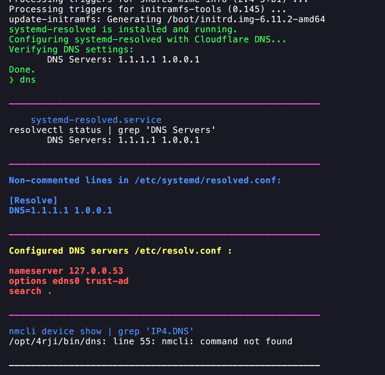 Ensure that the system is now using Cloudflare DNS and all changes have been applied successfully.Output should confirm