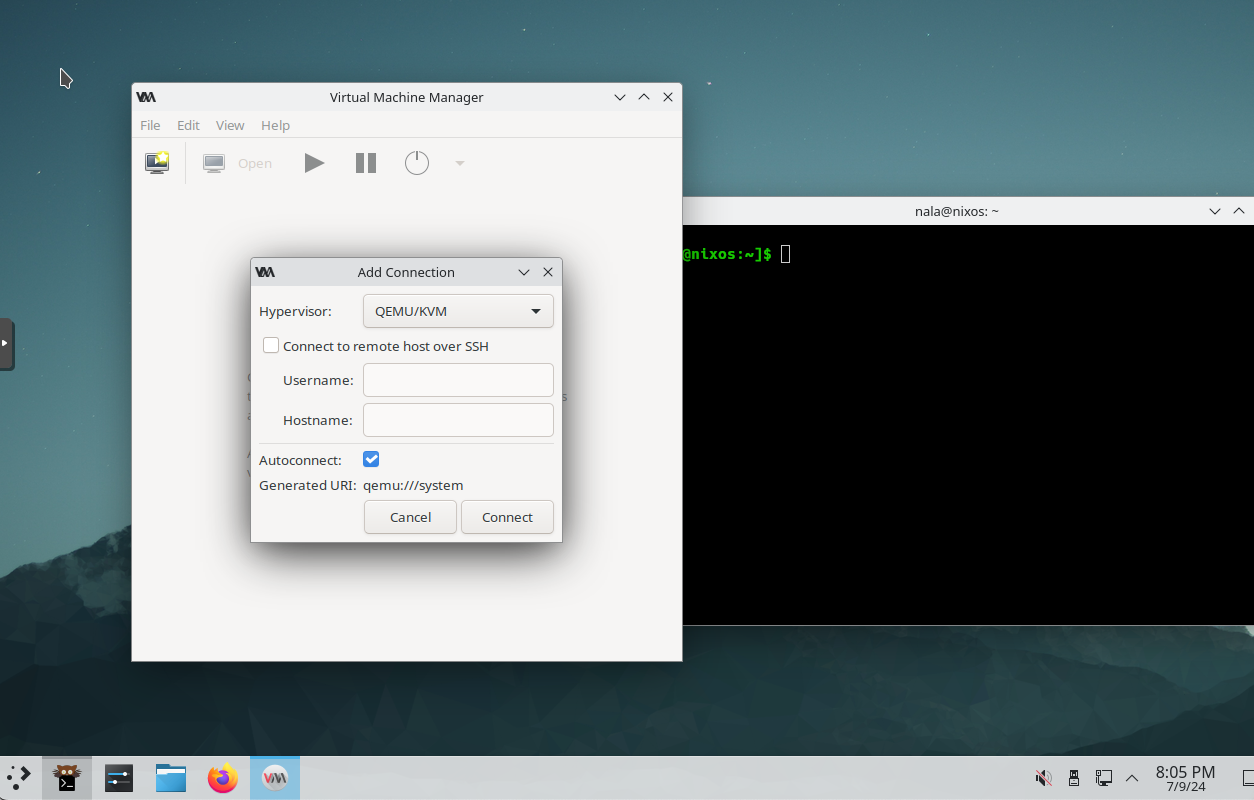 If you want to install Qemu with Virt-Manager, download the configuration file and add it to the nixos configuration file. -