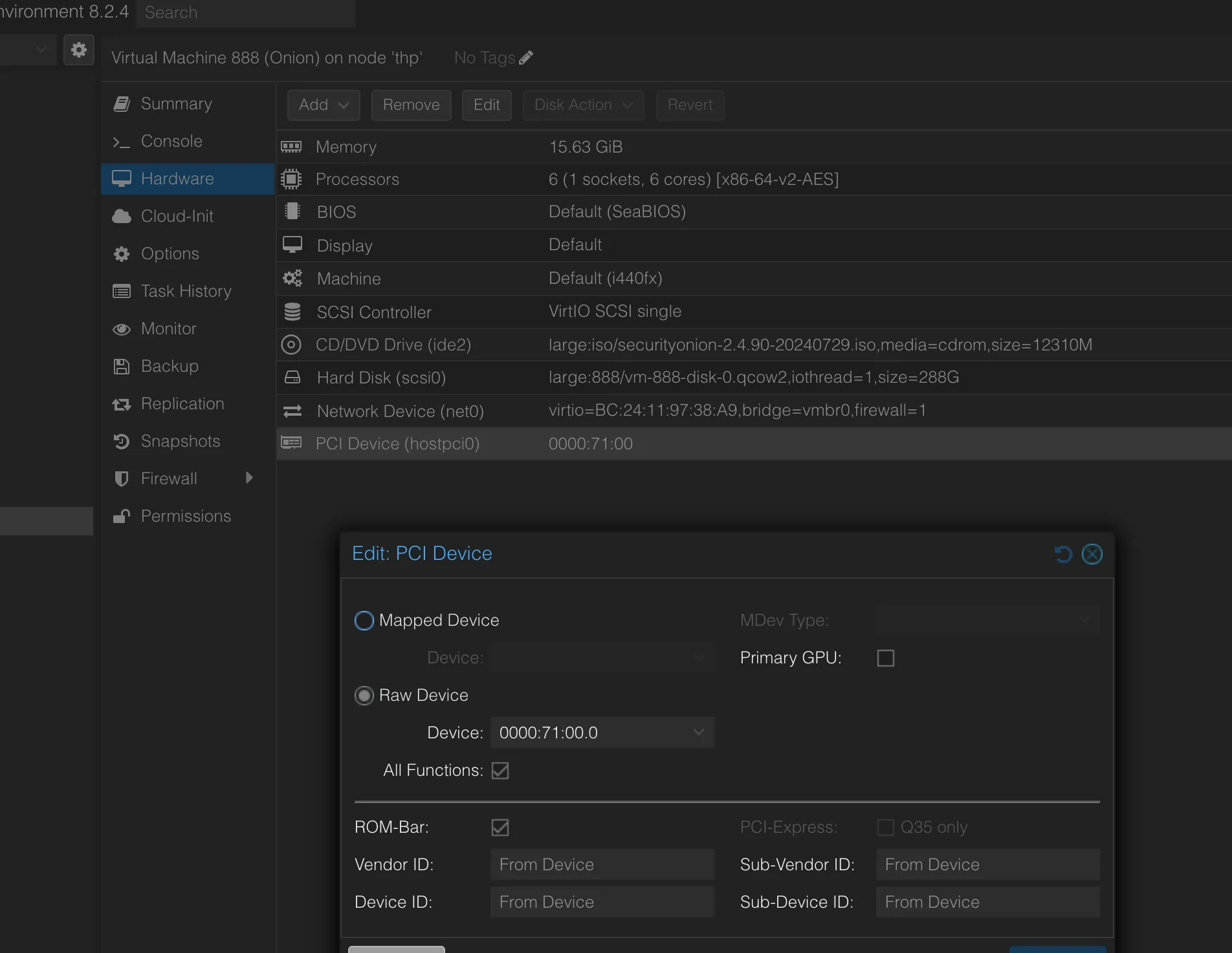 ip link show 1: lo:mtu 65536 qdisc noqueue state UNKNOWN mode DEFAULT group default qlen 1000 link/loopback 00:00:00:00:00:00 brd 00:00:00:00:00:00 2: enp113s0: ❯ ip link set enp113s0 down ❯ #I need to find the PCI bus-info (this is 71:00 ) ❯ ethtool -i enp113s0 driver: igb version: 6.8.8-3-pve firmware-version: 3.25, 0x800005d0 expansion-rom-version: bus-info: 0000:71:00.0 supports-statistics: yes supports-test: yes supports-eeprom-access: yes supports-register-dump: yes supports-priv-flags: yesmtu 1500 qdisc mq state UP mode DEFAULT group default qlen 1000 link/ether f4:6b:8c:c3:b4:6b brd ff:ff:ff:ff:ff:ff 3: eno1: mtu 1500 qdisc pfifo_fast master vmbr0 state UP mode DEFAULT group default qlen 1000 link/ether f4:6b:8c:c3:b4:6a brd ff:ff:ff:ff:ff:ff altname enp0s31f6 -