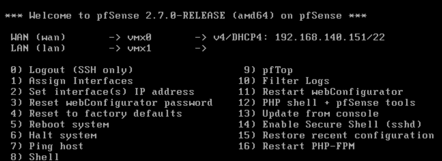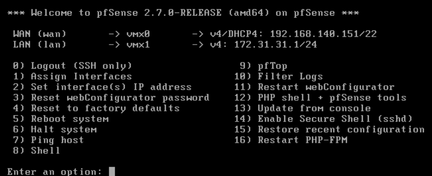 Press 2, then 2, n for dhcp, in the new LAN ipv4 address is the address for the gateway (172.31.31.1), then enter for none, not ipv6, and y for dhcp and y for web configuration.