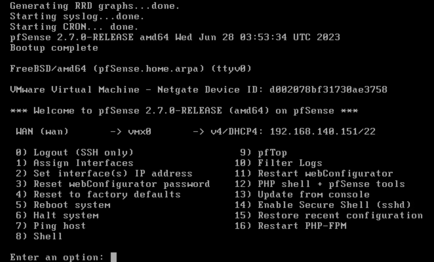 Press 1, then n, then set the vmx0 for wan and vmx1 for lan