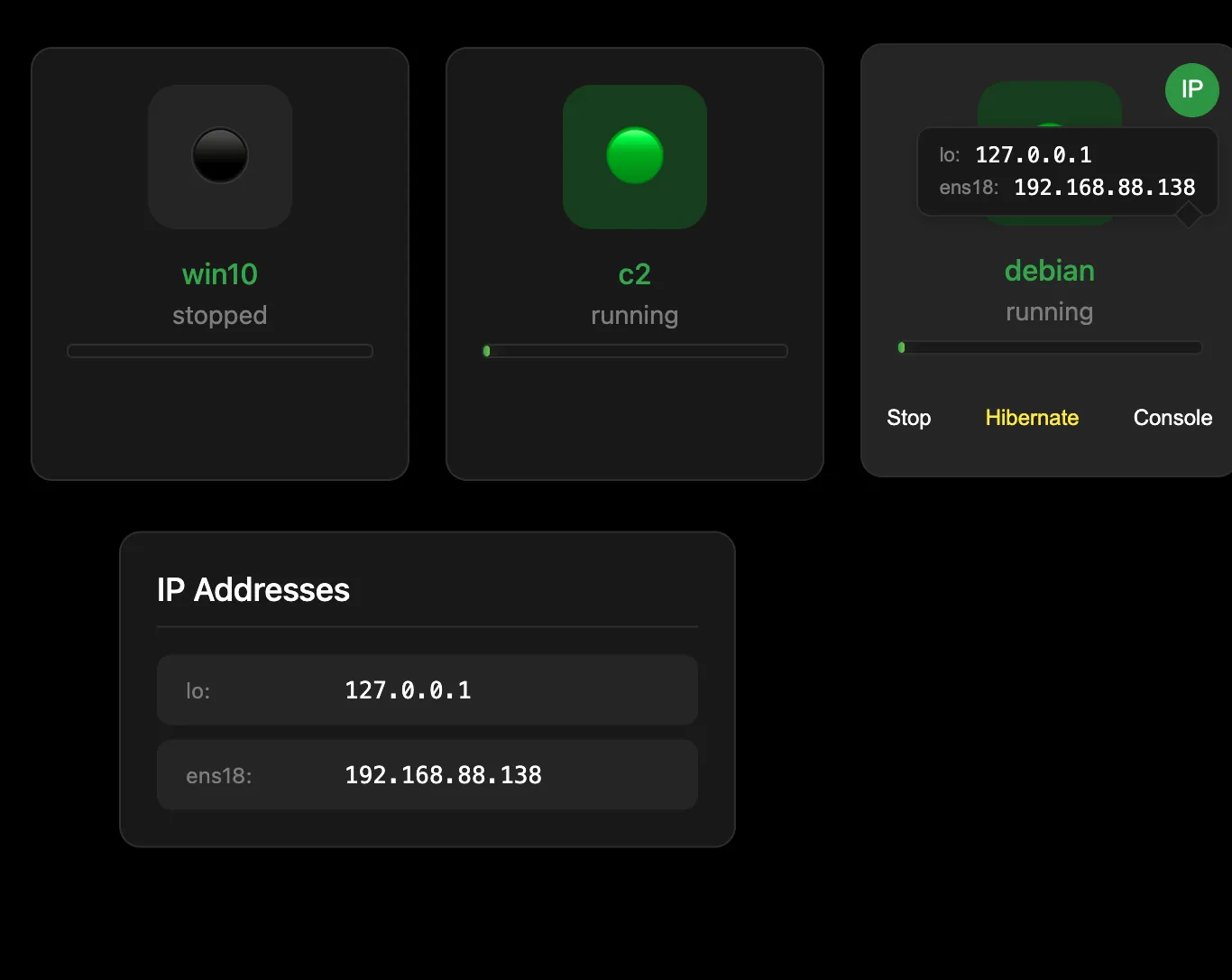 - When selecting a virtual machine, you can see the IP, interfaces, start it, STOP, Hibernate, and access the console from the interface.