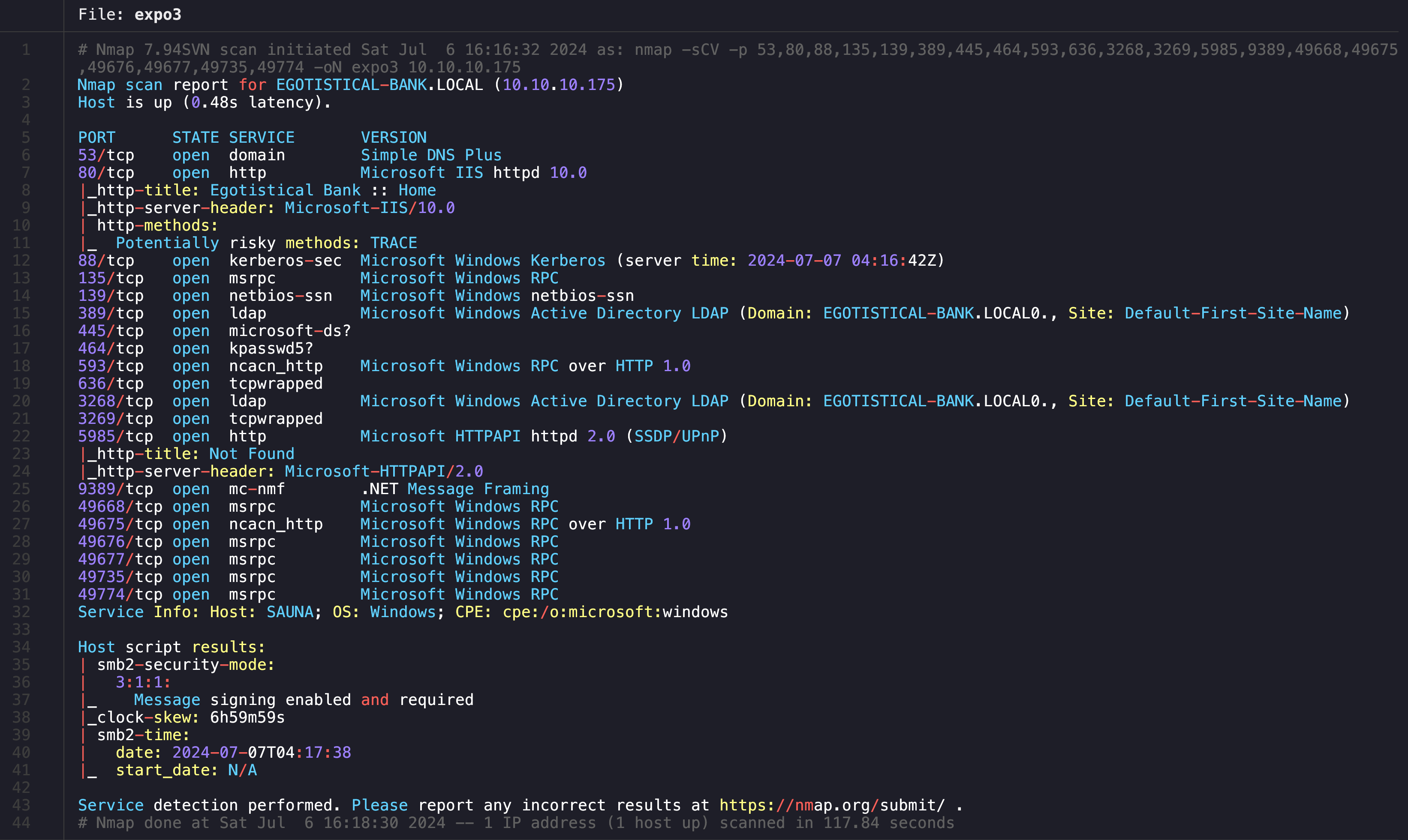 SMB 10.10.10.175 445 SAUNA [*] Windows 10 / Server 2019 Build 17763 x64 (name:SAUNA) (domain:EGOTISTICAL-BANK.LOCAL) (signing:True) (SMBv1:False)